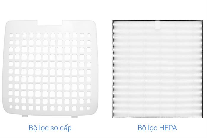 - Trang bị bộ lọc HEPA kết hợp với màng lọc thô, giúp loại bỏ hiệu quả bụi bẩn, phấn hoa và các hạt ô nhiễm trong không khí.