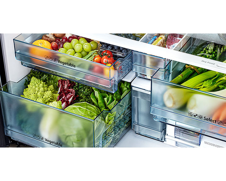 - Trong đó có ngăn rau quả riêng biệt có khả năng duy trì độ ẩm tối ưu đến 90% cùng với ngăn chuyển đổi đa năng Selectable Zone (97 lít) và ngăn chân không (6 lít).